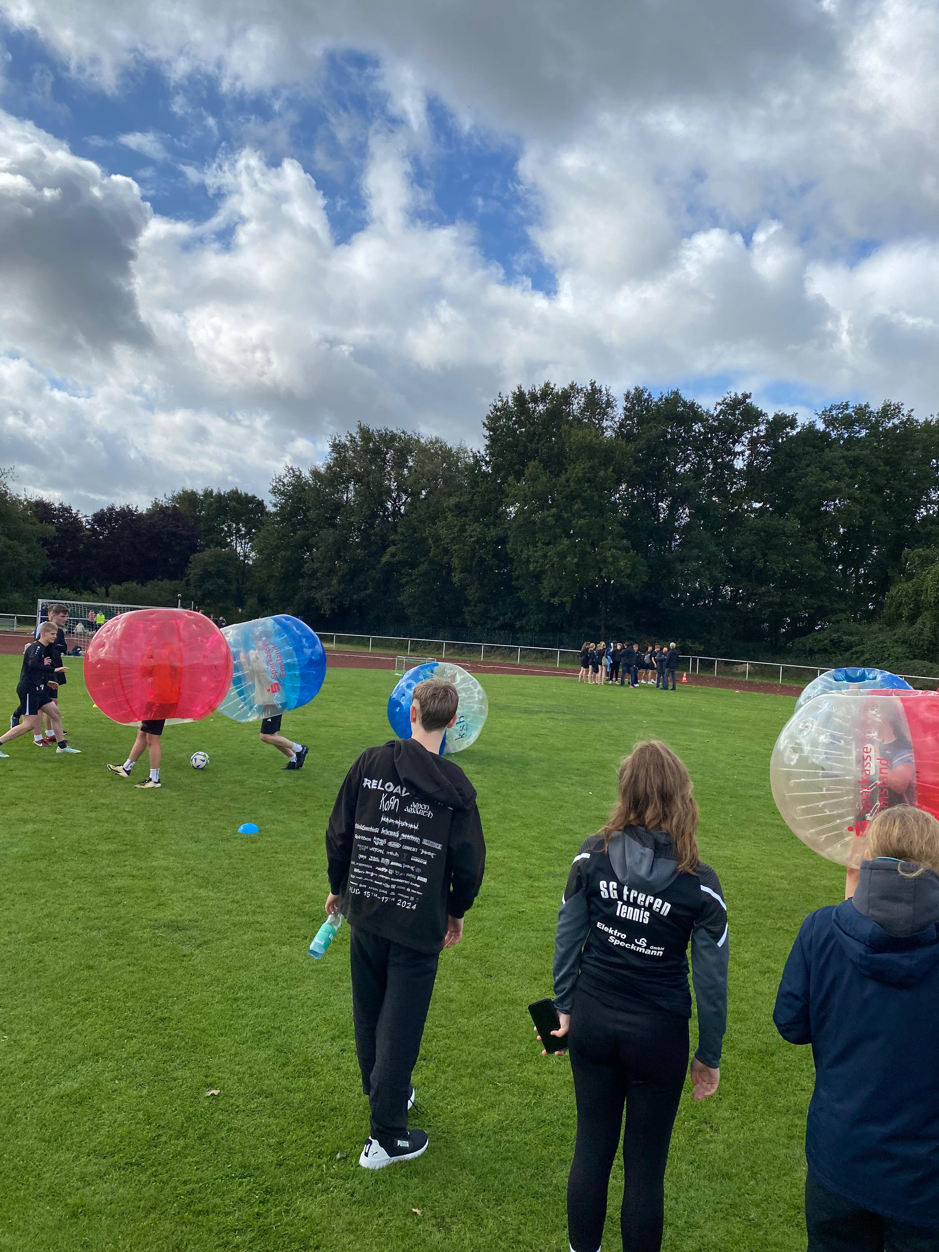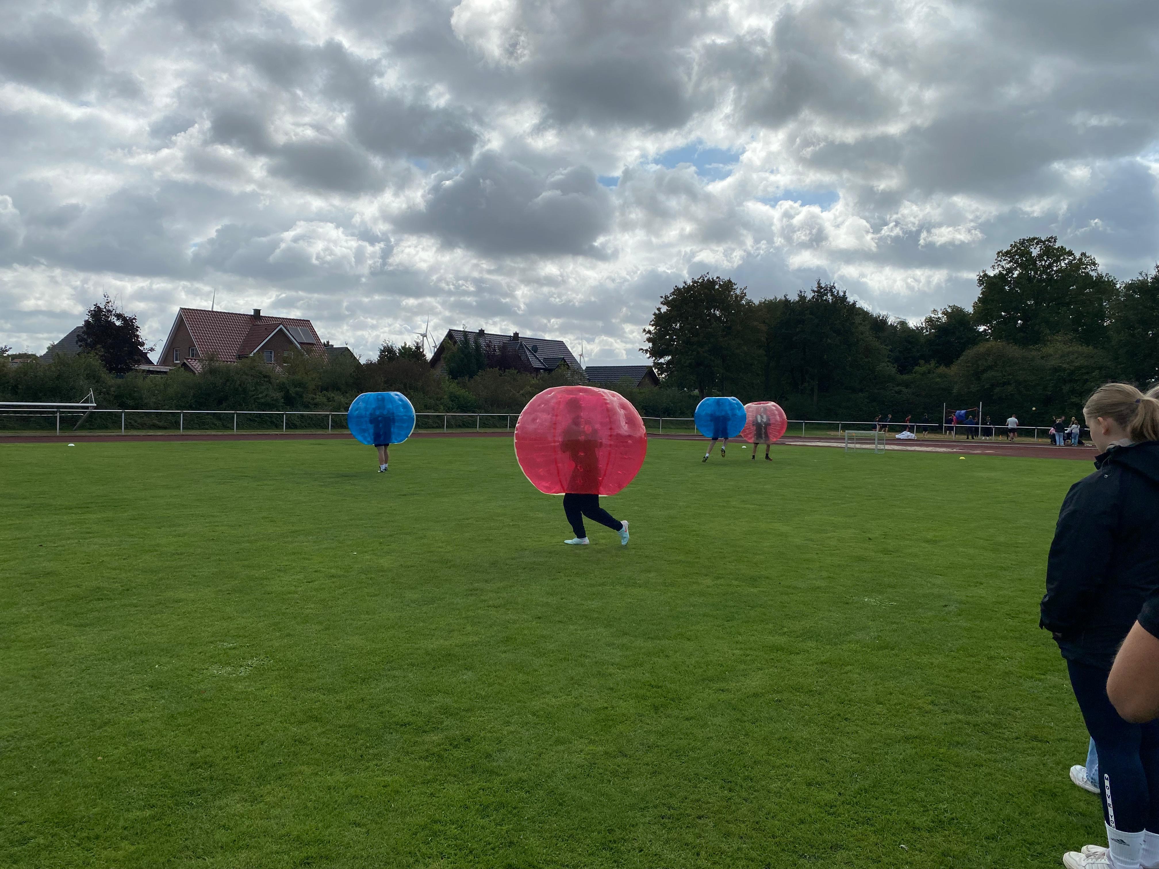 Draußen im Dehon-Stadion wetteiferten die Jahrgänge 11-13 im „Beachvolleyball Spezial“ sowie im „Bubble Soccer“. Während die klassische Sportart des Beachvolleyballs durch eine Sichteinschränkung erschwert und somit für Überraschungen gesorgt wurde, konnten die Schülerinnen und Schüler sich auf dem Fußballfeld in harte Zweikämpfe begeben, die selbst die Größten ‘umwarfen’. Fair und engagiert wurden jahrgangsinterne Turniere ausgefochten und nur kurzzeitig durch den einsetzenden Regen beeinflusst.