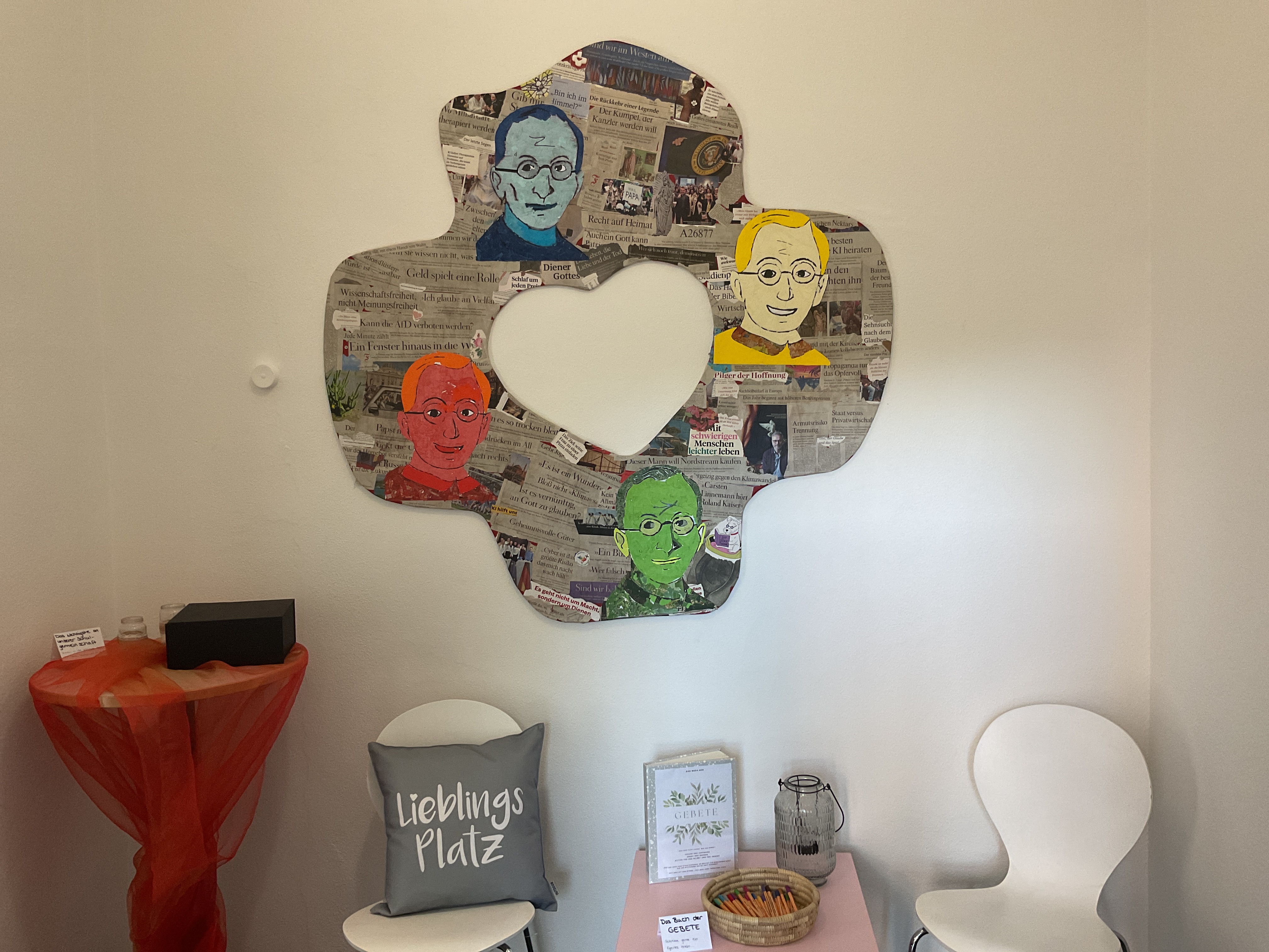 Dank großzügiger Spenden, fleißiger Hände und kreativer Köpfe ist ein sehr einladender Ort mitten in der Schule entstanden, ob für ein lockeres Treffen mit einer Schülergruppe, eine Teambesprechung, die Vorbereitung des Sozialpraktikums oder die Planung von Veranstaltungen wie Ora et Labora und den Vollversammlungen.