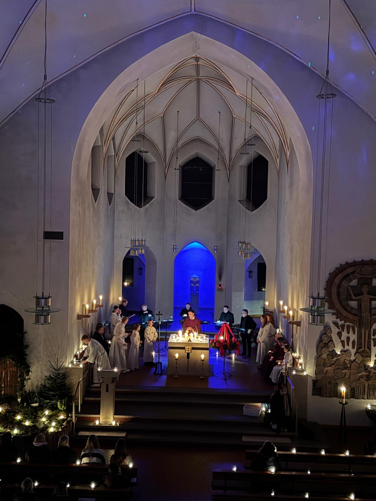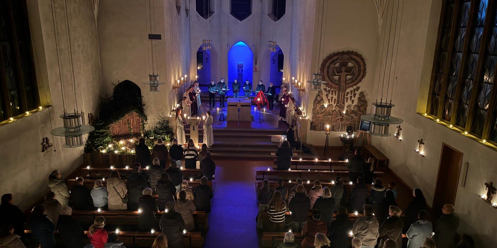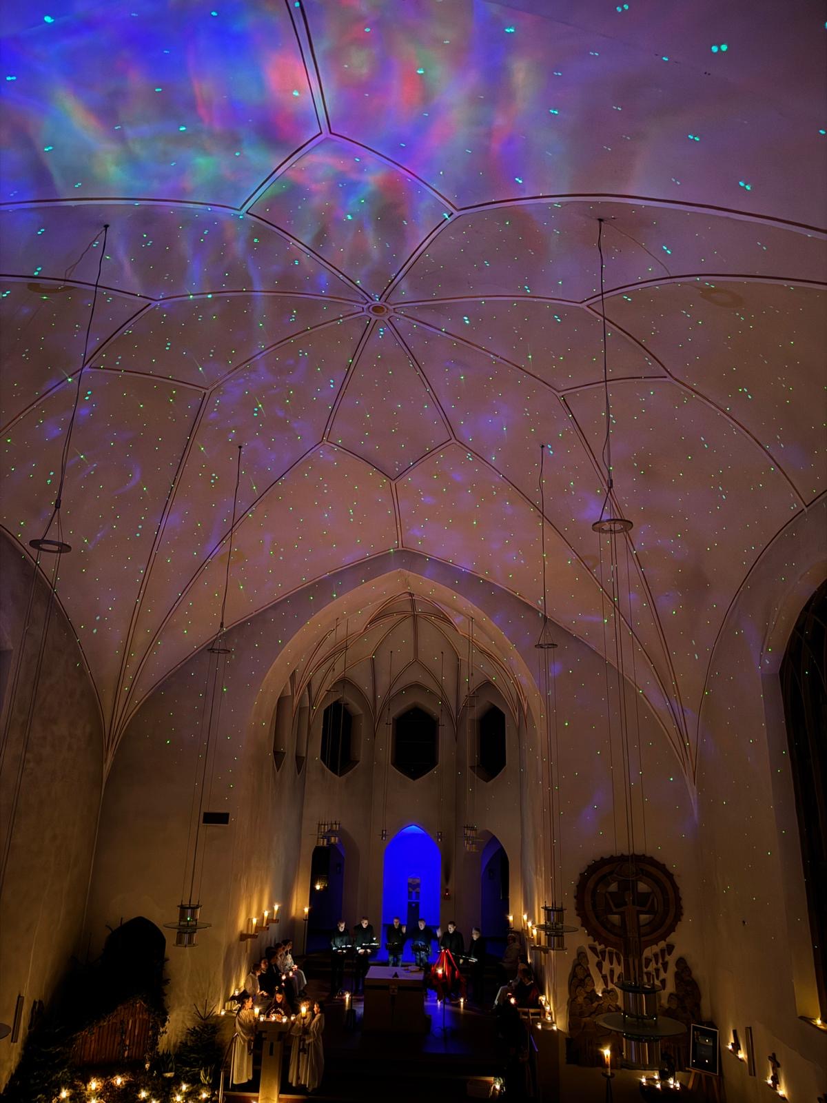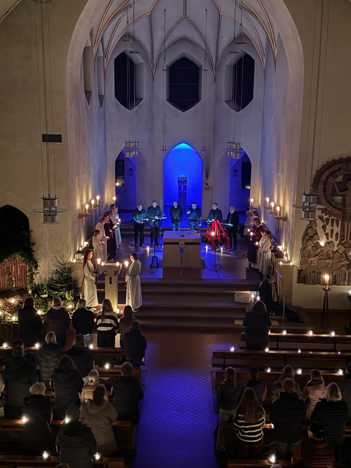 Manchmal gibt es Momente, die das Herz berühren. Ob das „Regina Caeli“ der Gruppe AufTakt oder selbst formulierte Gedanken zu „O komm, o komm Emmanuel“, musikalisch untermauert ebenfalls durch AufTakt und begleitet durch einen projizierten Sternenhimmel. Die uns Anvertrauten ermöglichten im Rahmen der diesjährigen Roratemesse unter Leitung von Pater Kreutzmann eine Ahnung, was es heißt, sich dem Geheimnis der Menschwerdung Jesu zu nähern. Dabei bewiesen die Kursmitglieder des Religionskurs RK 272+, dass mit einer wohlbedachten Komposition aus Bewährtem – hier seien nur Kerzenlicht sowie Jesaja genannt – mit Neuem – vorübergehender Sternenhimmel in der Klosterkirche – ein zuversichtlicher Blick in eine friedvolle Zukunft berechtigt ist. Schön, dass unter den Mitfeiernden Jung und Alt dabei gewesen sind, die auch die anschließende Begegnung im Refektorium zu einem wohltuenden Abschluss haben werden lassen. Allen, die diese Erfahrung haben möglich werden lassen, ein herzliches Dankeschön. Ein besonderer Dank gilt Frau Pastorin Schaefer für das gute ökumenische Miteinander!