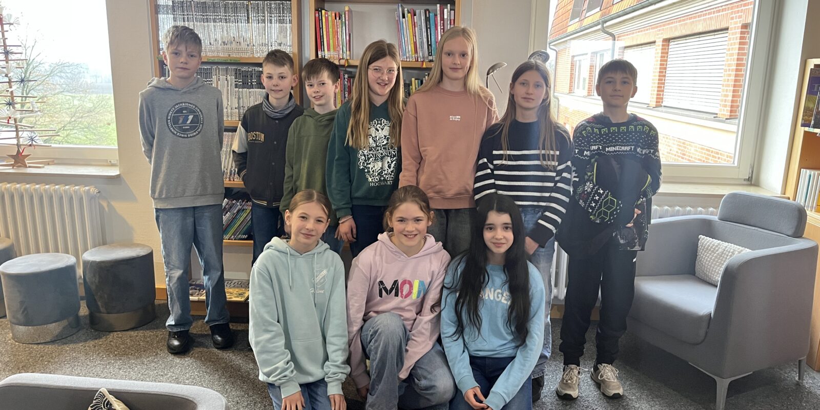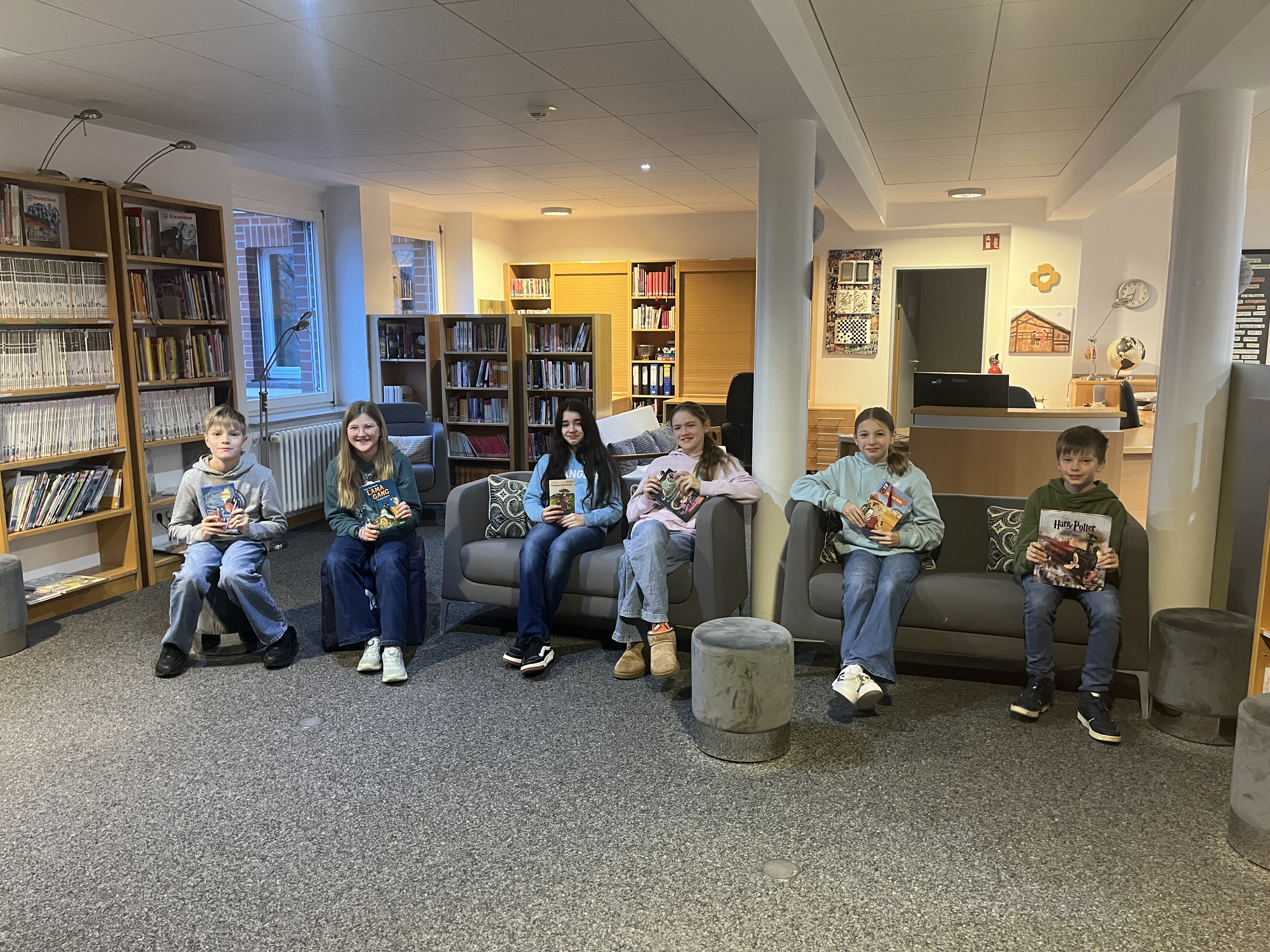 Am Donnerstag wurde es schon in der ersten Stunde lebendig in unserer Bibliothek: Jeweils zwei Schülerinnen und Schüler aus jeder Klasse des Jahrgangs 6 traten zum Schulentscheid des diesjährigen Vorlesewettbewerbs vor einer kleinen Jury gegeneinander an. Alle präsentierten zunächst einen vorbereiteten Auszug aus einem selbstgewählten Jugendroman und lasen im Anschluss eine unbekannte Passage aus Cornelia Funkes Adventskalendergeschichte Hinter verzauberten Fenstern.