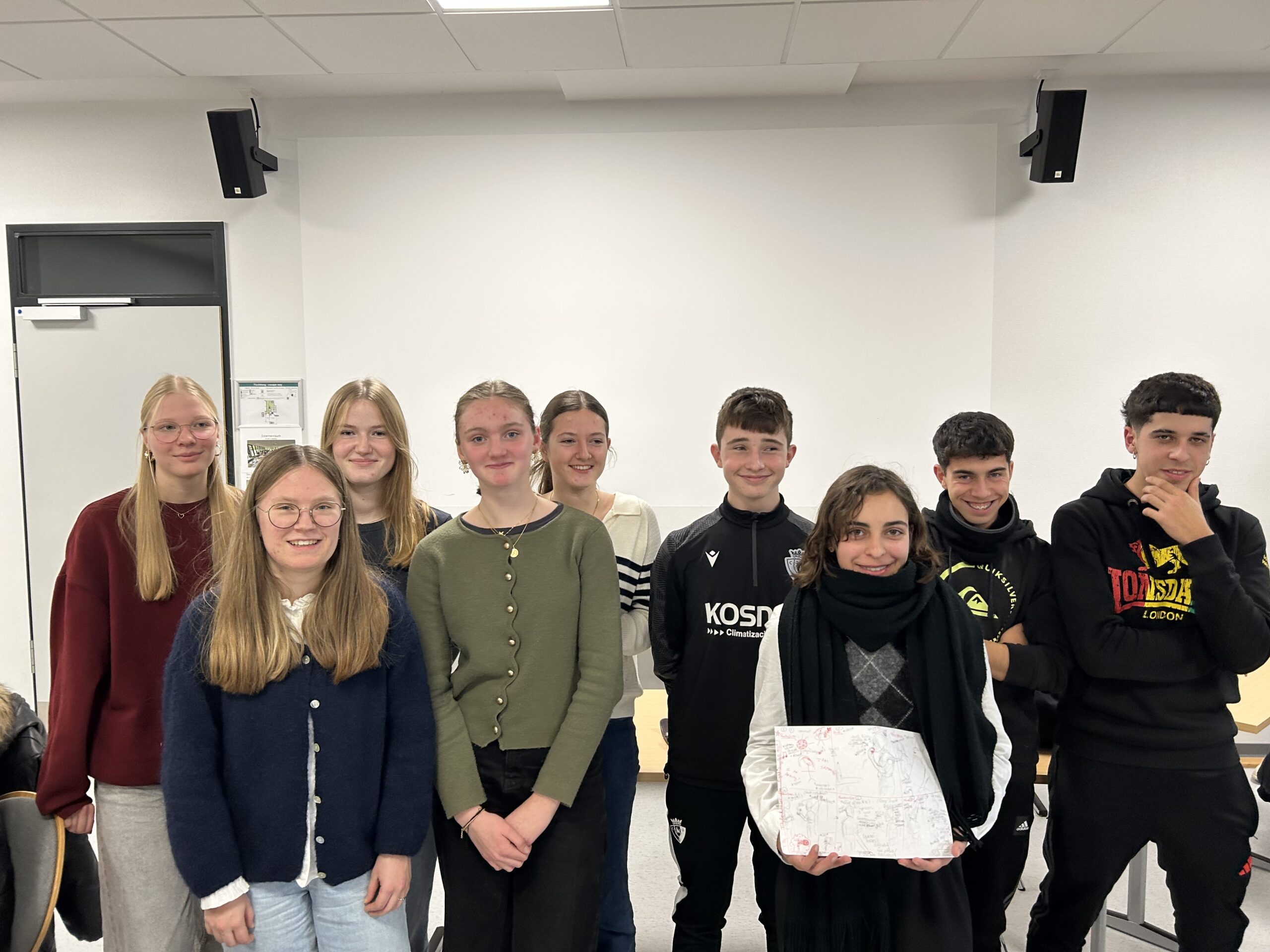 Mit den beiden Schulen wollen wir bis zum ersten Halbjahr des kommenden Schuljahres gemeinsam im Rahmen des Erasmus+-Programms einen Film erstellen. Bei diesem ersten von drei Treffen ging es darum, sich auf eine Handlung/ein Thema zu einigen und erste Skizzen für ein gemeinsames Drehbuch zu erarbeiten. Das Drehbuch soll dann in den nächsten Wochen online entstehen und im April wollen wir mit den drei Schulen zusammen in Puente la Reina drehen. Zur Handlung soll noch nicht viel verraten werden, aber es wird auf jeden Fall sehr blutig werden und ein Mordfall wird eine Rolle spielen.
