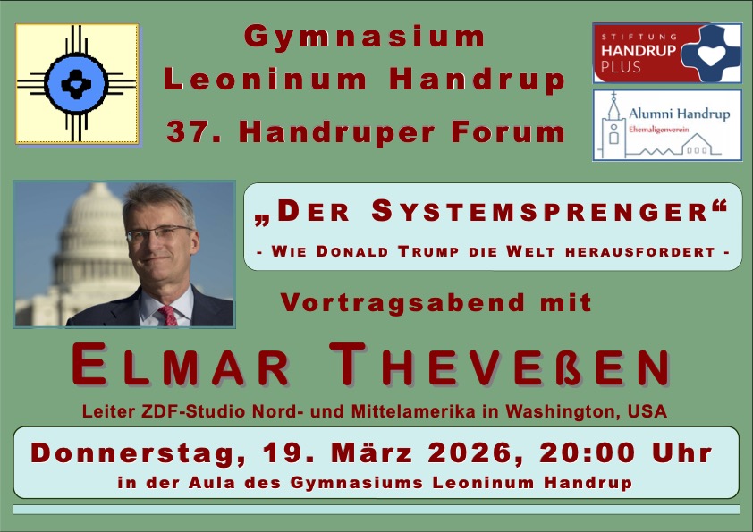 Nachdem aus nachvollziehbaren Gründen der Vortragstermin mit dem Leiter des ZDF-Studios in den USA Elmar Theveßen im Rahmen des Handruper Forums bereits zweimal abgesagt werden musste, findet der Vortrag „Der Systemsprenger – Wie Donald Trump die Welt herausfordert“ nun am Donnerstag, dem 19. März 2026, um 20 Uhr in der Aula des Gymnasiums Leoninum Handrup statt.