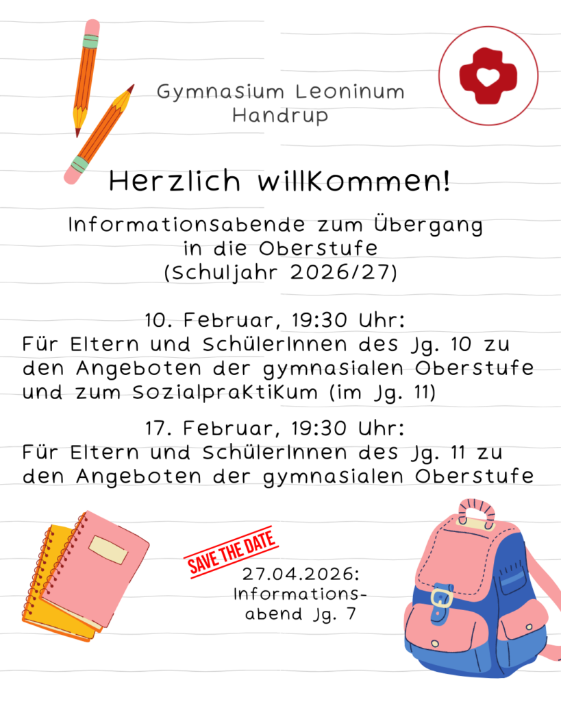 Informationsabende zum Übergang in die Oberstufe 09. Februar 2026 | Homepage-Team | Kategorien: Aktuelles Informationsabend Oberstufe Wir laden alle interessierten SchülerInnen und Eltern herzlich ein!