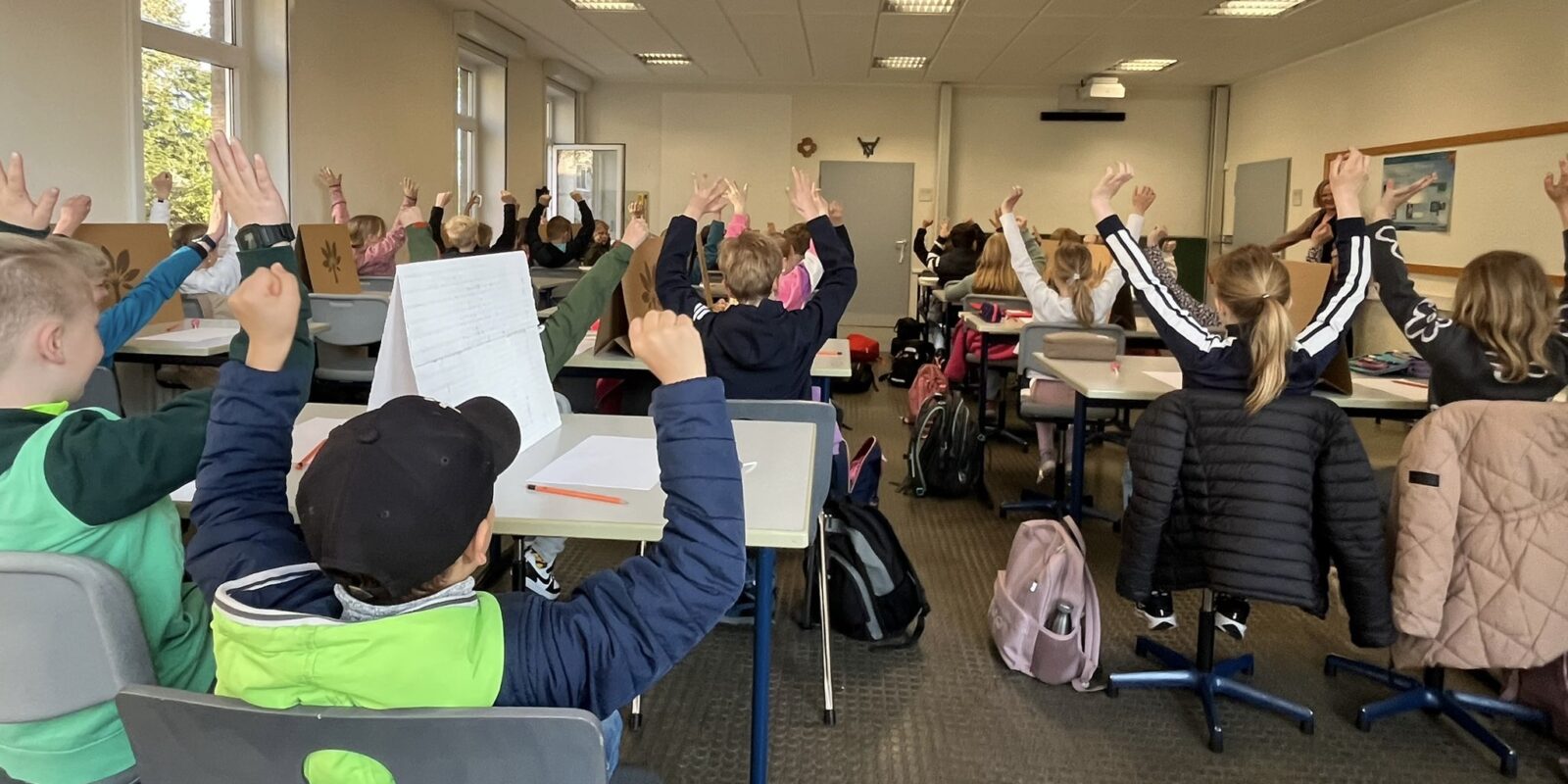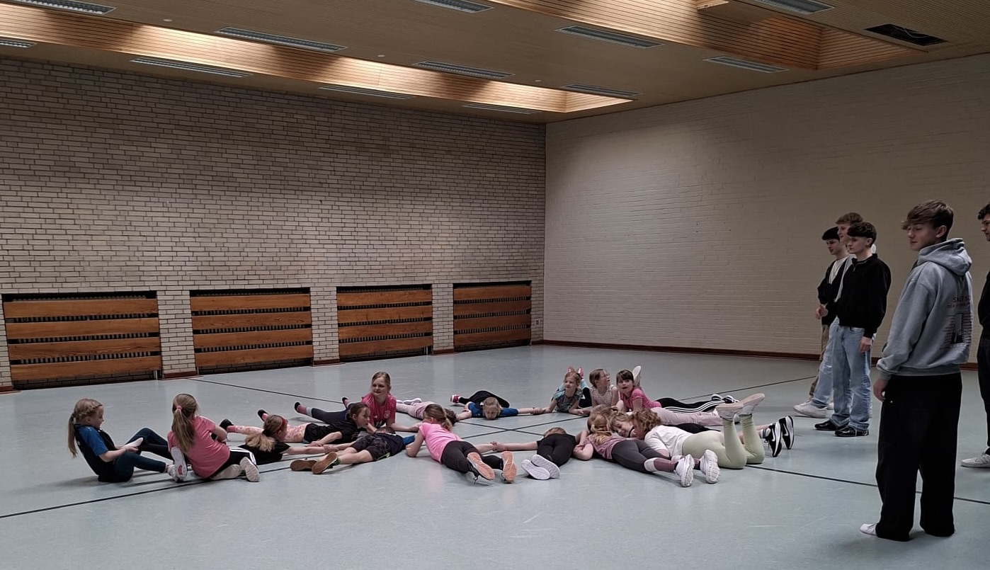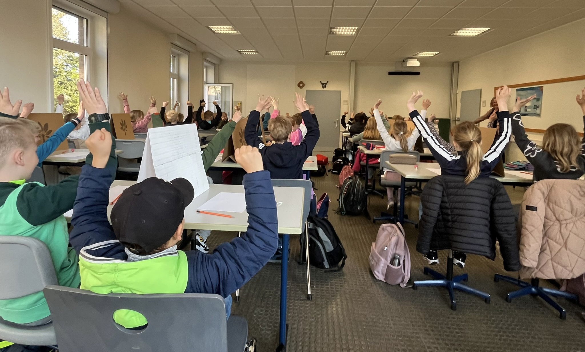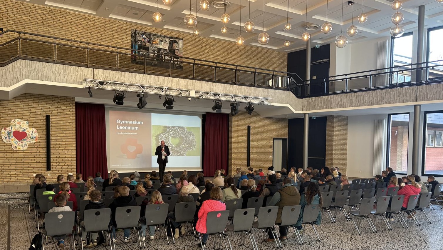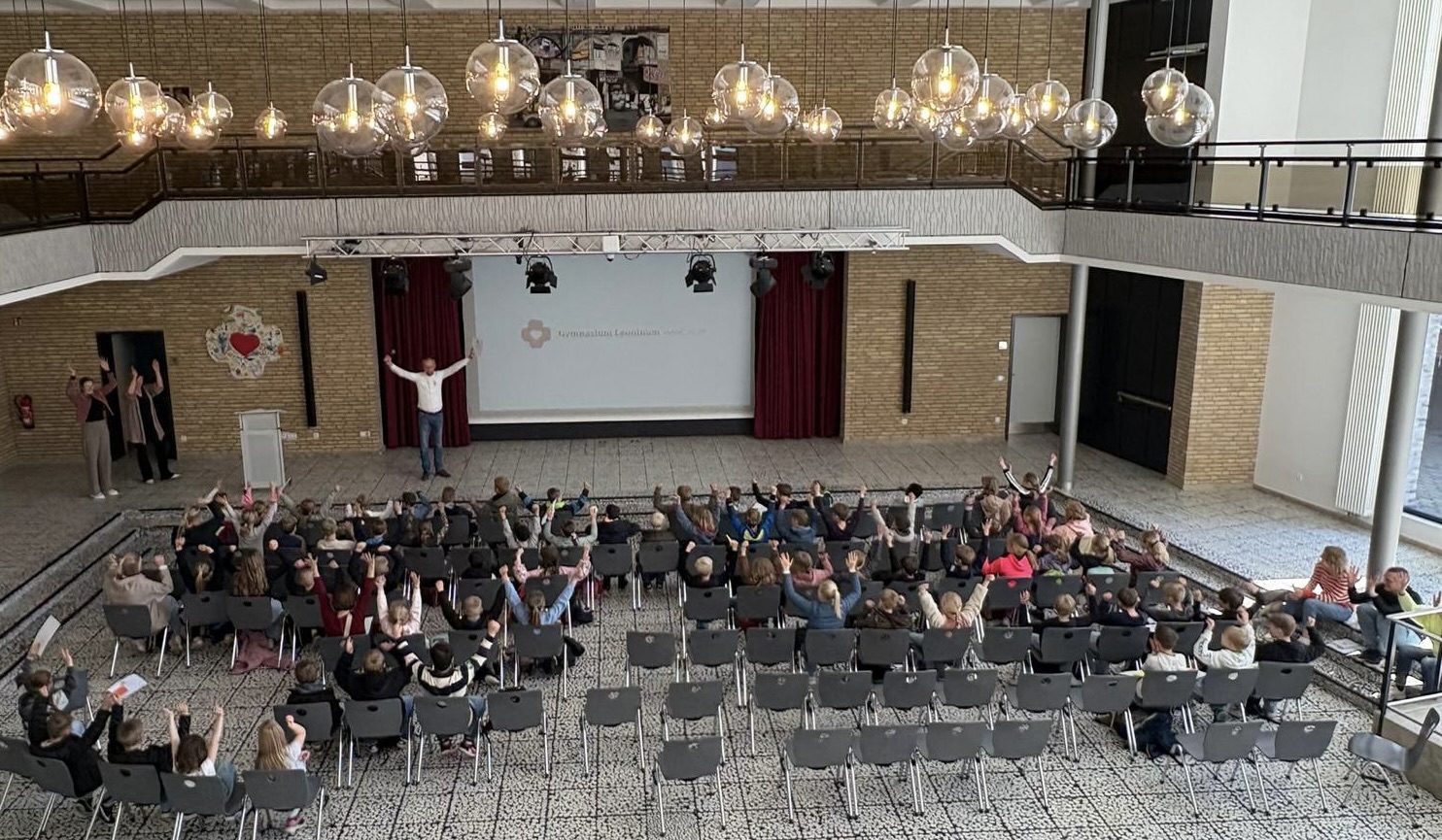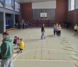 Am 15.04.26 fand bei uns am Leoninum die Niedersächsische Landesrunde der Grundschul-Matheolympiade statt. Mit dabei waren 68 Schülerinnen und Schüler von 12 Grundschulen der Region Emsland/Osnabrück. Alle konnten in einer Klausur ihr mathematisches Wissen zeigen und durften sich anschließend gemeinsam mit unseren Sport-LKs auspowern. Währenddessen wurden die Klausuren von weiteren Schülerinnen und Schülern des Jahrgangs 12 gewissenhaft korrigiert.