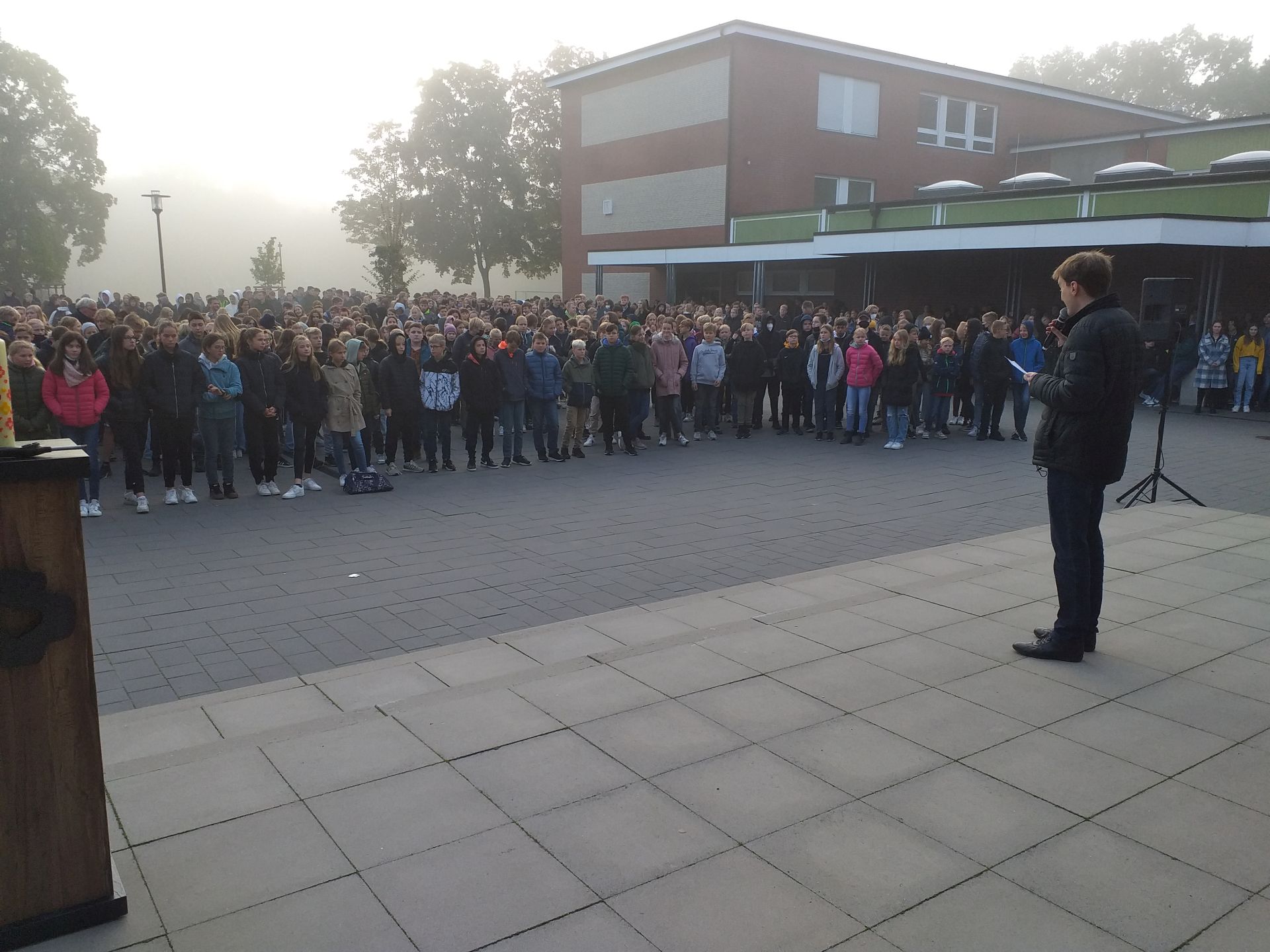 Mit einem Impuls von P. Kreutzmann über die Abkürzung “SCJ”, die eben nicht nur für die Herz-Jesu-Priester (= Sacerdotes a sacro Corde Jesu) steht, sondern auch für “sub condicione Jacobaea” (= unter dem Vorbehalt des Jacobus = “so Gott will”) begann die Oktober-Vollversammlung des Gymnasiums Leoninum auf dem Handruper Schulhof.