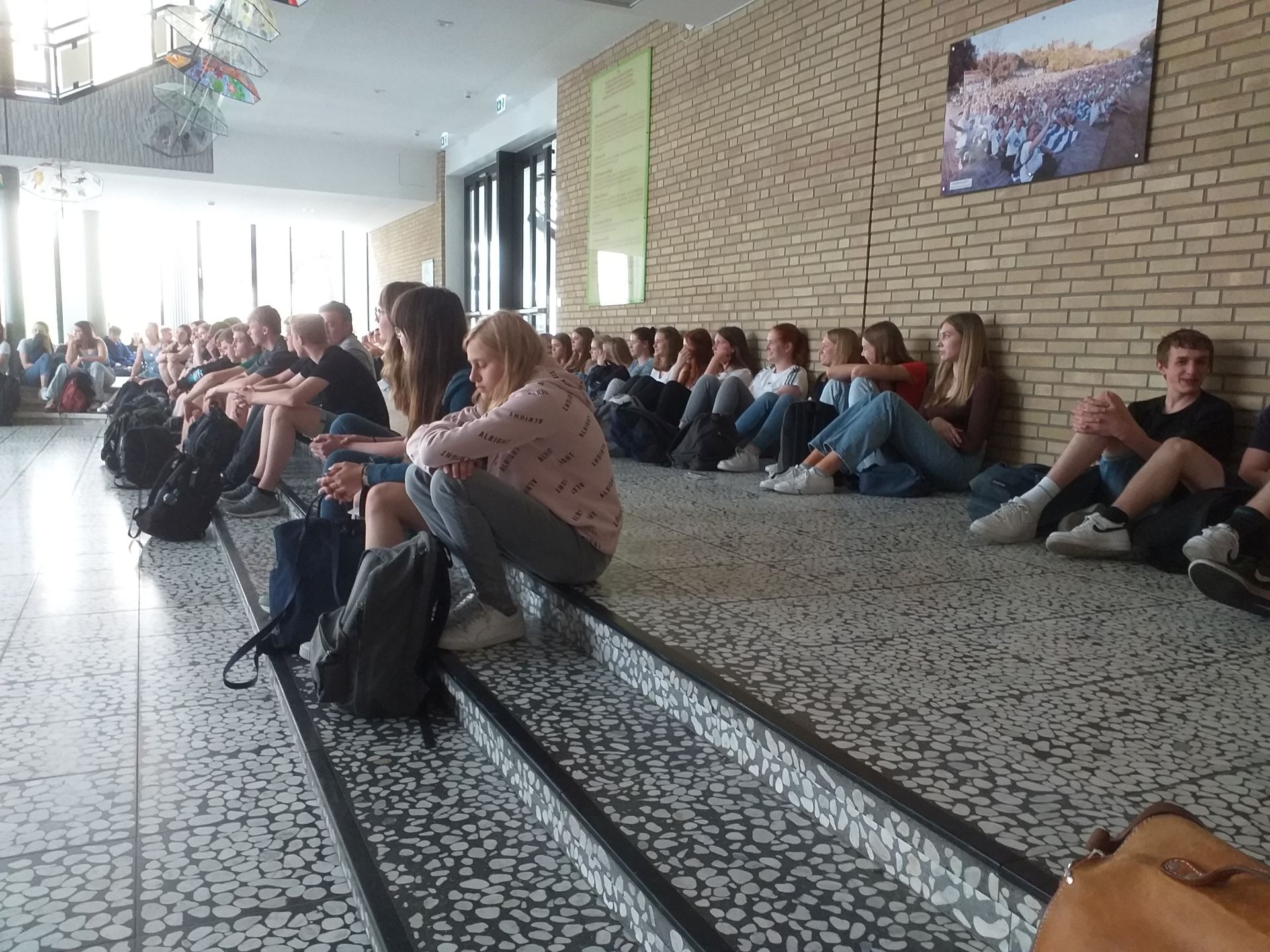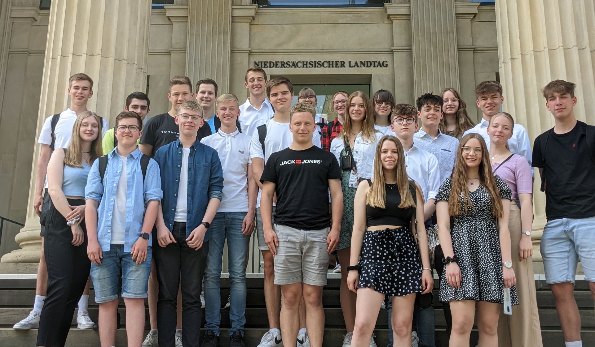 Bei sommerlichen Temperaturen machte sich am Mittwoch, dem 18.5., die TG Kreutzmann (Jahrgang 11) auf den Weg nach Hannover, um den Niedersächsischen Landtag zu besuchen. Nach zwei Jahren coronabedingter Pause gehörten wir zu den ersten Gruppen, die dort wieder empfangen wurden und eine Landtagssitzung von der Besuchertribüne aus verfolgen konnten. Bereits beim Ausstieg aus dem Bus wurden wir vom Landtagsabgeordneten Bernd-Carsten Hiebing begrüßt, der für den Wahlkreis Meppen zuständig ist, zu dem auch Handrup gehört. Nach einer kurzen Einführung in die Arbeit des Landtags durch eine Landtagsmitarbeiterin konnten wir für etwa 45 Minuten eine Debatte im Plenum mitverfolgen, in der es um den drohenden Fachkräftemangel in den kommenden Jahren ging. Schließlich nahmen sich gleich drei (!) Abgeordnete Zeit, um uns kennenzulernen und auf Fragen einzugehen. Neben Herrn Hiebing von der CDU war Andrea Kotte von der SPD anwesend (für sie waren wir die allererste Besuchergruppe, da sie erst kürzlich in den Landtag nachgerückt ist) und Volker Bajus von den Grünen, der in seiner Fraktion den Bereich Osnabrück/südliches Emsland abdeckt. Wir fühlten uns geehrt! Nach einer Mittagspause in der Innenstadt von Hannover traten wir die Heimreise an. Es war ein gelungener Besuch mit vielen interessanten Eindrücken, die sicher noch länger nachwirken werden. Ein besonderer Dank gilt dem Besucherdienst des Landtags für die reibungslose Organisation und den örtlichen Abgeordneten für ihre Zeit und ihr Interesse.