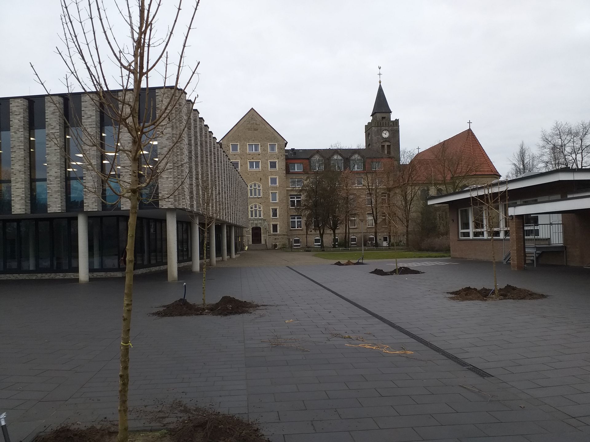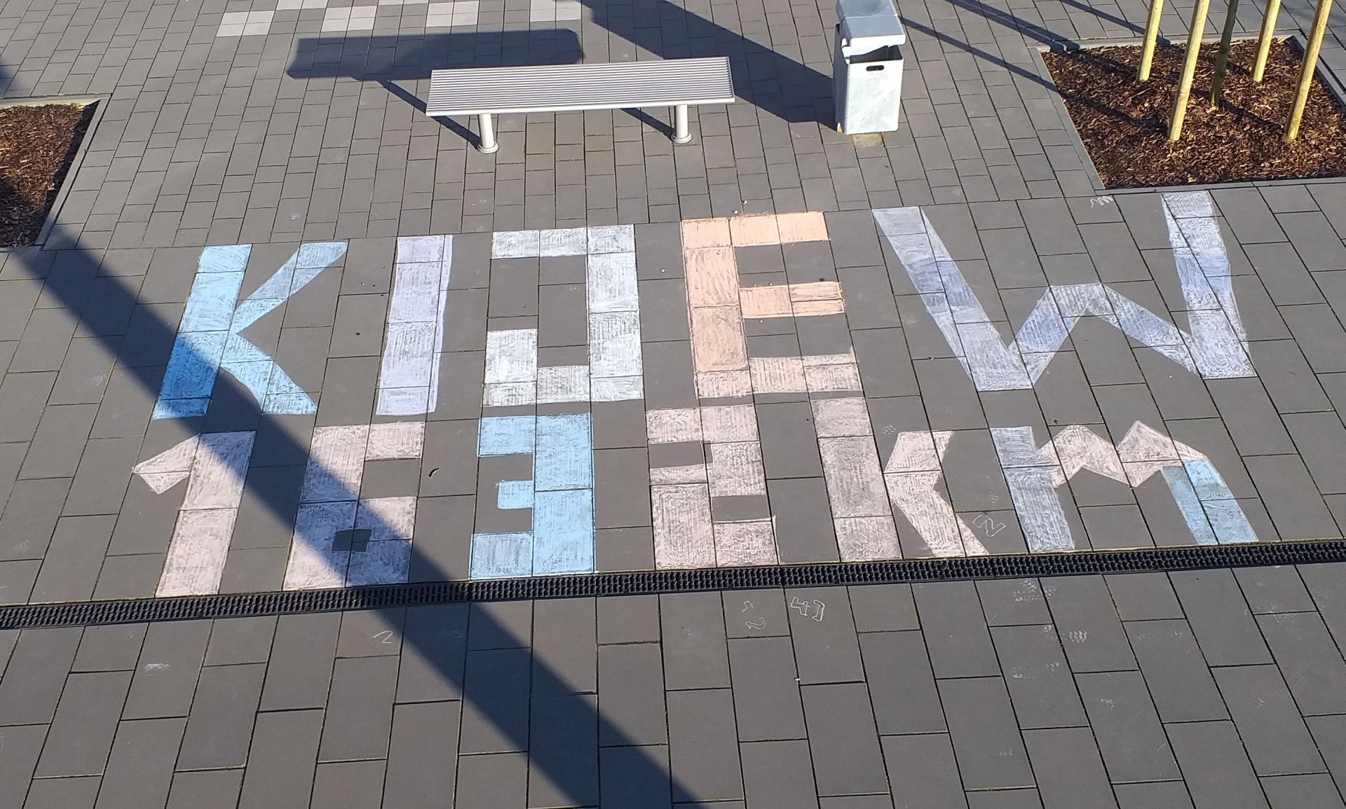 Natürlich herrscht auch am Gymnasium Leoninum eine große Betroffenheit über die kriegerischen Ereignisse in der Ukraine. Viele Gespräche wurden und werden geführt von SchülerInnen untereinander und mit den LehrerInnen. Dabei sind viele Sorgen und Ängste spürbar – Krieg in Europa! Ein Politik-Kurs des 12. Jahrgangs schrieb heute mit Straßenkreide in großen Lettern auf den Schulhof: “Kijew 1632 km”
