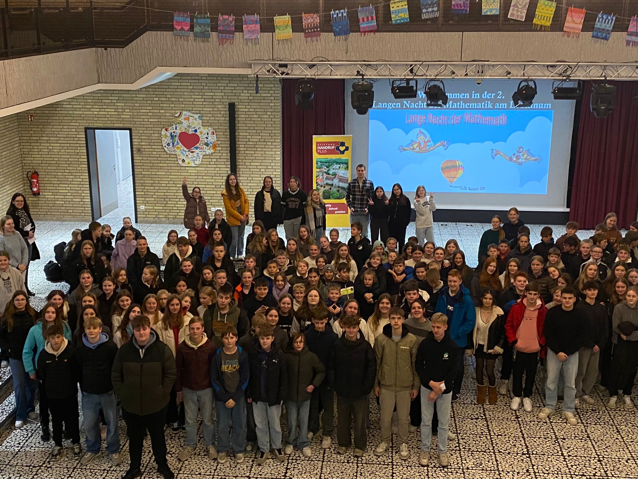Am vergangenen Freitag trafen sich 180 Schüler/innen und die begleitenden Lehrkräfte um 17 Uhr in der Aula, um gemeinsam in die Mathenacht zu starten. Zuerst wurde das Buffet aufgebaut und die Schlafräume eingerichtet. Dann versammelten sich die Schüler in den Arbeitsräumen, um gemeinsam in Teams die verschiedensten Aufgaben zu lösen. Die Schüler knobelten mit Hilfe der Lehrer/innen an den herausfordernden Fragestellungen – mal mehr, mal weniger erfolgreich. Während der Bearbeitung der Aufgaben wurde auch etwas Leckeres vom reichhaltigen Buffet genossen, sodass die Köpfe wieder mehr Energie hatten und schließlich rauchten. Je später es wurde, desto mehr Schüler/innen erlagen der Müdigkeit und gingen in den eigens eingerichteten Schlaflagern in den verschiedenen Klassenräumen schlafen. Um etwa 5:30 Uhr wurden diese dann wieder geweckt, um die Schlafzimmer aufzuräumen und das Buffet abzubauen. Um 6:30 Uhr wurden alle abgeholt und die 2. Lange Nacht der Mathematik am Leoninum war beendet. Fazit: Ein großer Spaß, aber auch eine große Herausforderung!
