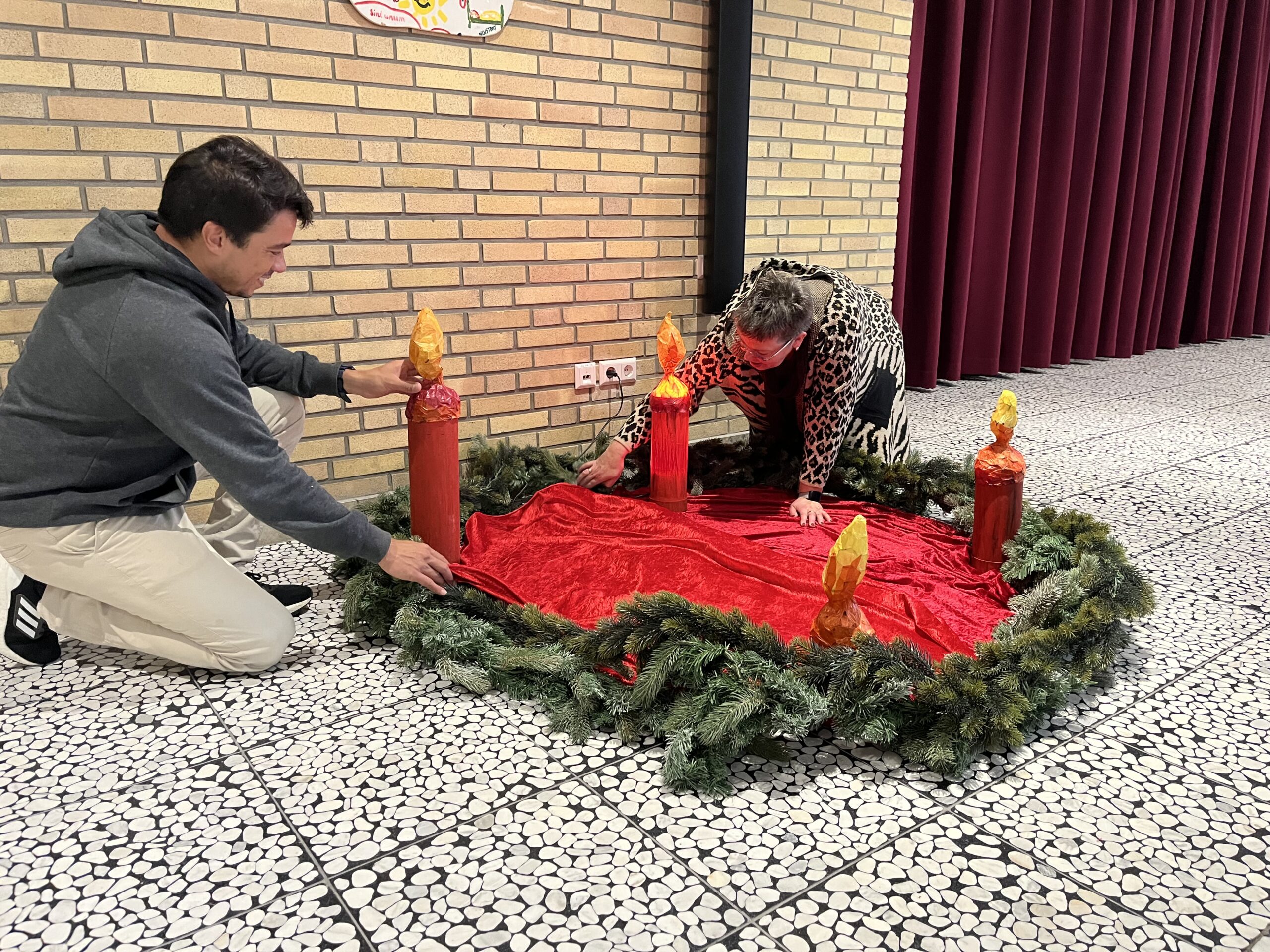 Das Beitragsbild zeigt Pater Paulo und Frau Meemann, die die Schule weihnachtlich schmücken.