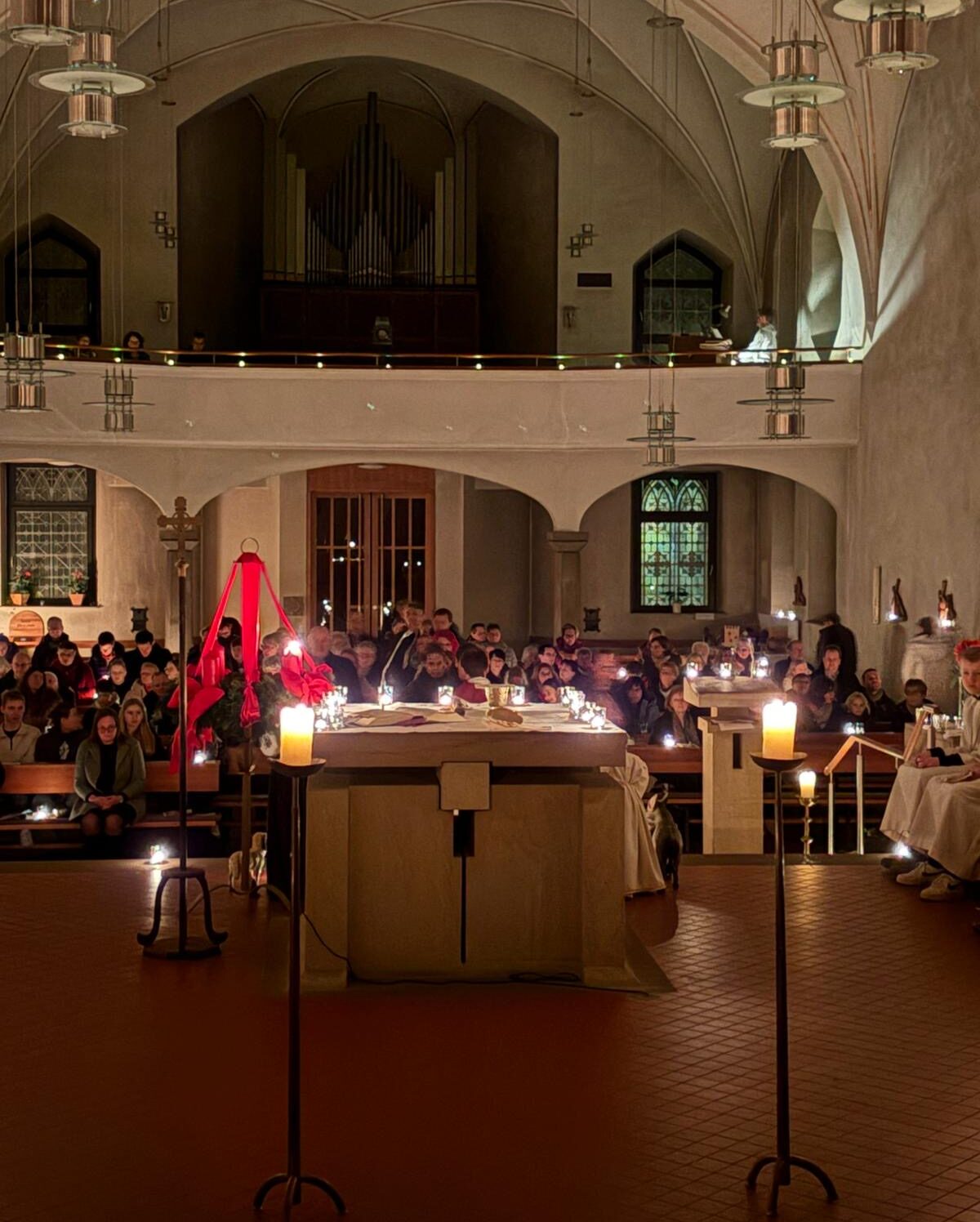 Eine lieb gewonnene Tradition im Advent stellt die Rorate-Messe in der Klosterkirche dar. In diesem Jahr bereiteten Mitglieder des Leistungskurses Religion, Jahrgang 12, die besondere Adventsmesse, die am 6. Dezember ab 6 Uhr stattfand, mit Pater Ricardo Diniz als Zelebrant vor. Selbst formulierte Texte, aber auch altbekannte Gebete von Dietrich Bonhoeffer und Huub Osterhuis sowie berührende Lieder der Gruppe Auftakt und des Organisten Jens Lindemann inspirierten die Anwesenden, ihren Weg zur Krippe achtsam zu reflektieren. Für das leibliche Wohl sorgte im Anschluss das Team des Refektoriums, sodass alle gestärkt an Leib und Seele in den Tag starten konnten.