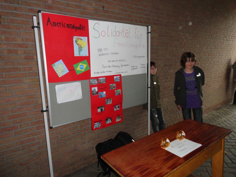Gekoppelt an das Thema „Kinder Gottes in der einen Welt“ haben die Schülerinnen und Schüler der Klassen 6c und 6d gemeinsam mit ihrer Lehrerin Frau Holterhues im Religionsunterricht nicht nur theoretisch über Solidarität gesprochen, sondern die neu gewonnenen Erkenntnisse direkt praktisch in einem Solidaritätsprojekt umgesetzt. So verkauften sie Anfang Juni an zwei Vormittagen in den großen Pausen Kuchen und Waffeln und arbeiteten in verschiedenen Bereichen bei Familien und Freunden. Insgesamt kamen 420 € zusammen, die sie nun unserer Partnerkindertagesstätte in Brasilien spenden.